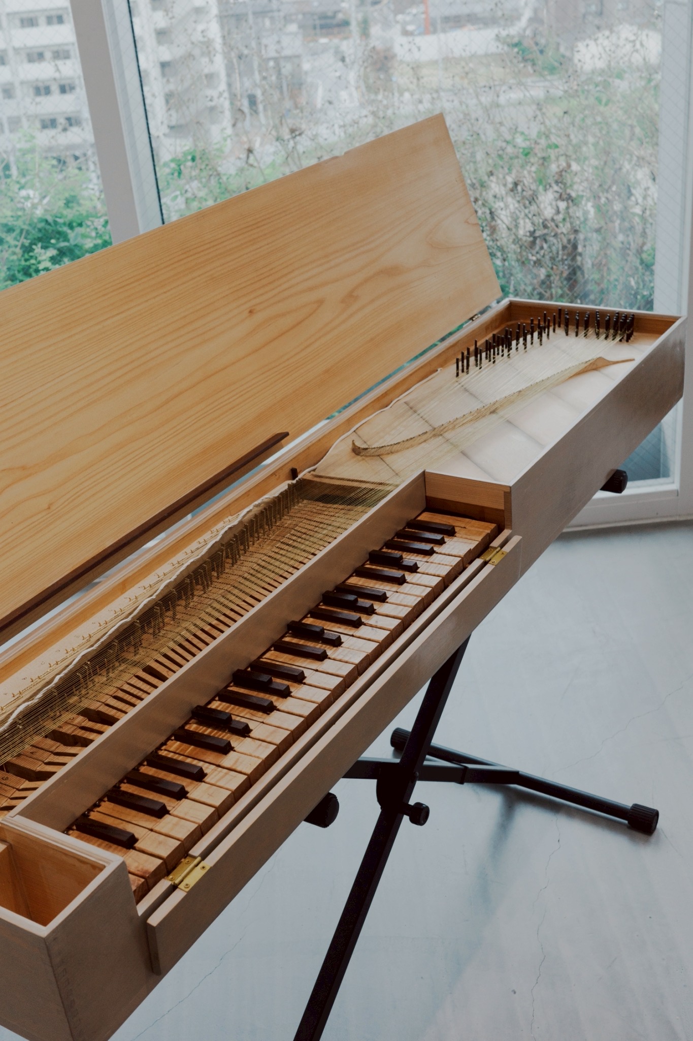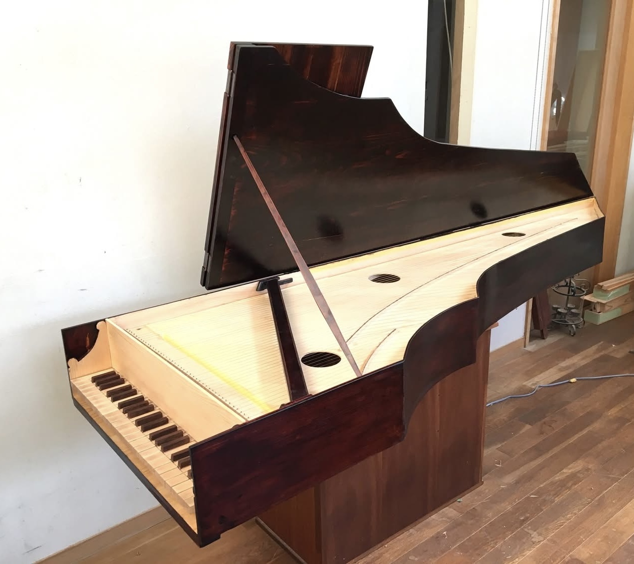 本作は、通常のチェンバロより1オクターブ低い音域で構成されている。しかしチェンバロは倍音を多く含む楽器であるため、実際の聴感覚としてはそれほど低く感じられない。漆を施すことで音はより太く、広がりのある響きとなっている。演奏者から見て右側に設けられた二段階のカーブは、13世紀の絵画にのみ確認される形状であり、現存する通常のチェンバロには見られない造形である。張力を二枚の板に分散させるこの構造が、音響にどのような効果をもたらすのか、今後演奏を重ねながら検証していきたい。