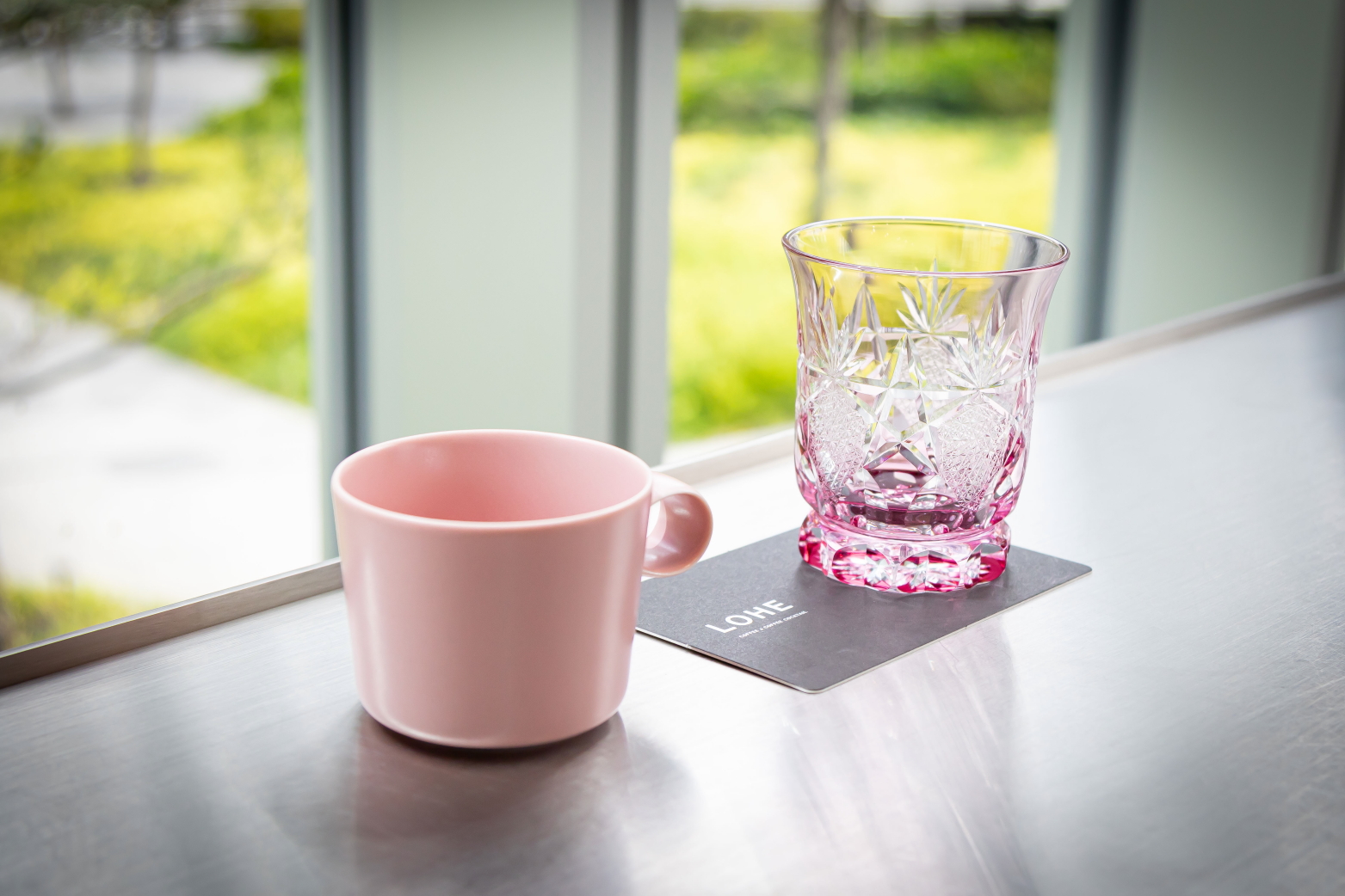 ピンクのカップは、森氏が過去に門下で働いていたという器作家・イイホシユミコ氏に特注したもの。江戸切子のグラスも、この色のものを探し求めたそう